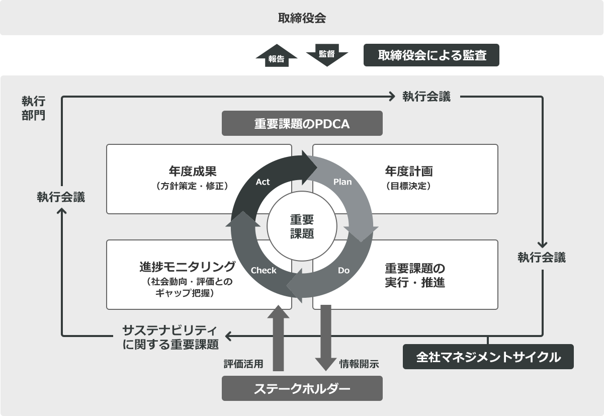 このような考えのもと、各担当部門が個別課題への対応を進め、サステナビリティに関する重要課題に対し、執行会議での議論を通じて着実に取り組みを進め、取締役会は年に1回以上(必要に応じて適宜)その報告を受け、サステナビリティ課題への取り組みを監督しています。