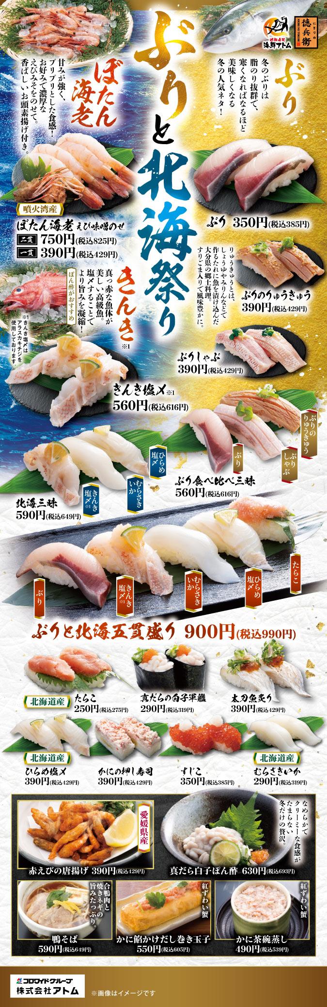 「ぶりと北海祭り」 北海の幸が勢揃い!濃厚なえび味噌がたまらない「噴火湾産 ぼたん海老」 「高級白身 きんき 」「北海道産 ひらめ」など冬のおすすめ全20品を 1月13日(火)よりにぎりの徳兵衛、海鮮アトムにて販売!