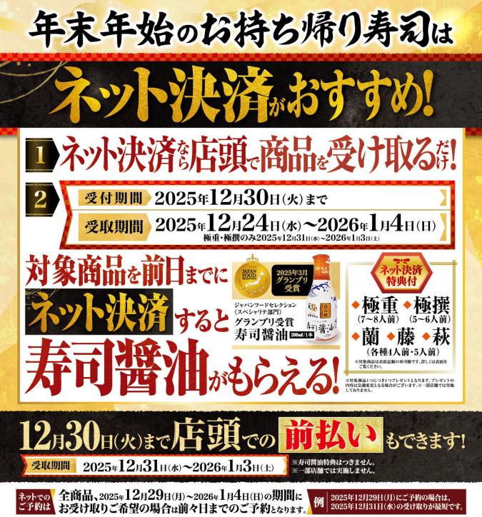 そして、12月24日(水)から1月4日(日)のお受け取り限定(極重・極撰のみ2025年12月31日(水)~2026年1月3日(土))で、対象商品を前日までにネット決済いただくと、対象商品1つにつき、ジャパン・フード・セレクション《スペシャリテ部門》グランプリ受賞の『寿司醤油』1本をプレゼント!