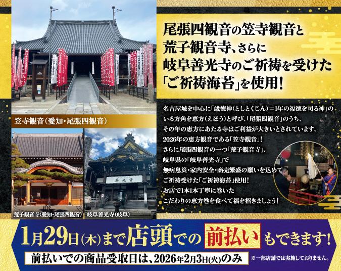 今年は、尾張四観音の笠寺観音と荒子観音寺、さらに岐阜善光寺のご祈祷を受けた「ご祈祷海苔」を使用!お店で1本1本丁寧に巻いたこだわりの商品です。